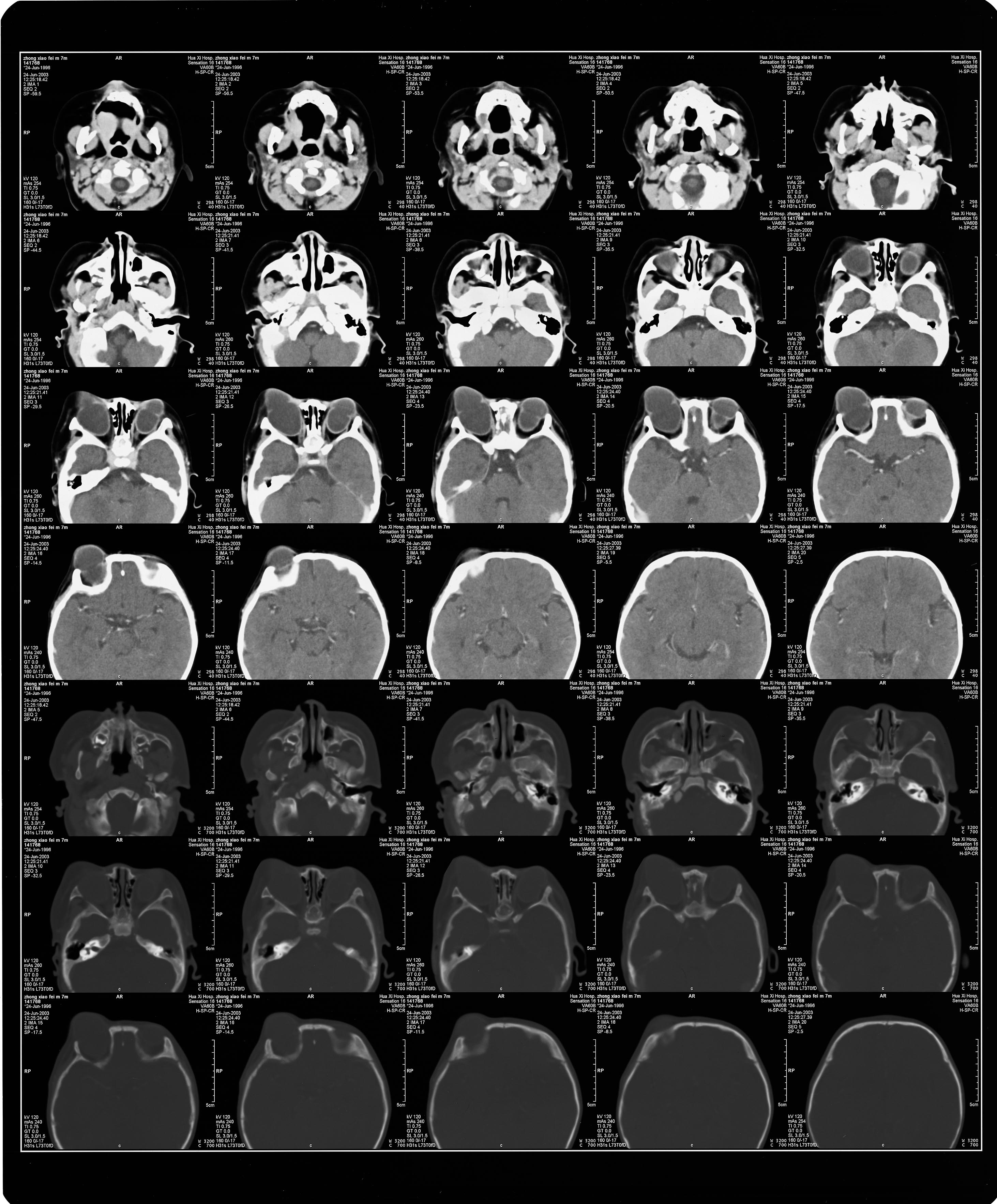 现病史:   生后即看不到双眼,在眼球部位可见一层相连的皮肤,皮下隐约可见类眼球样体并逐渐增大.右眼尤为明显.2003年6月24日以先天性隐眼畸形入院.