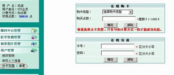 在线购卡中根据您的E币(论坛虚拟货币)数量选择购买点数(10:1),然后得到一个充值卡号和密码。