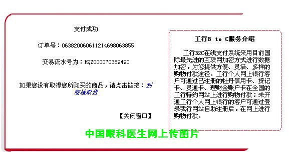 4、弹出中国工商银行的网上银行支付界面,填入您工商银行网上银行支付卡号(可以在线申请)提交,然后确认并输入密码就可以完成整个交易。支付成功后可看得“到商城取货”字样,点击后显示“在线支付成功”,再点击查看订单,显示订单已经确认,付款已经付清。