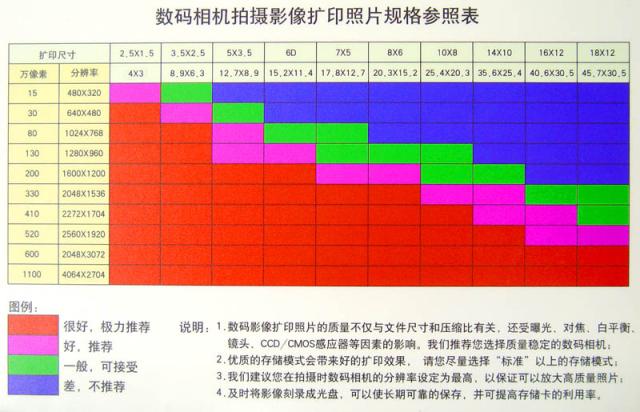 数码相机拍摄影像照片扩印规格参照表