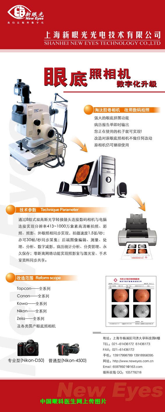 眼底照相机数字化升级——由上海复旦大学医学院著名教授组织开发的科研成果。并以上海复旦大学附属中山医院作为临床的科研单位,是国内最早研发本系统的公司,经过多年研究攻克在老式眼底照相机上成功实现了数码成像,淘汰了原烦琐胶卷方式。在科研推广过程中总结各地医院反馈,在原有基础上不断提升、完善,成像清晰度更高,功能更强大,实现患者信息资料与图象的高效存储、管理、传输与共享,升级范围扩大至Topcon、Nikon、Kowa、Canon、Zeiss等全系列仪器。