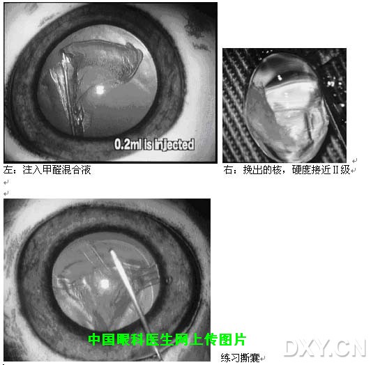 1.取细针头抽吸甲醛和异丙醇混合物(3:1) 2.沿睫状体平坦部刺入晶体中间,针头在晶体中间划开一潜在腔隙,注入0.2ml上述混合液,(过多会胀破晶体) 图1 左上 3.15-20min后晶体核会变硬,接近人的2-3 级核 图2.右上(已取出的核) 4.此时可以练习转核\水分离等操作,还何以进行超乳等,前囊也会变得不那麽韧了,较人眼略差些.不过也好多了。图3