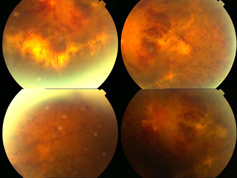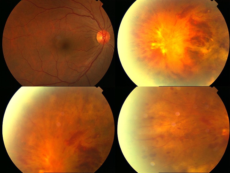 双不充血,眼前节情况(-),左眼瞳孔药物性散大。双晶体清,右眼玻璃体及眼底情况(-),左眼玻璃体轻度混浊,视乳头高度水肿,后极部视网膜水肿隆起,可见大片深层出血,视网膜周边部颜色青灰色,视网膜下可见黄白色病灶,视网膜散在深层和浅层出血。