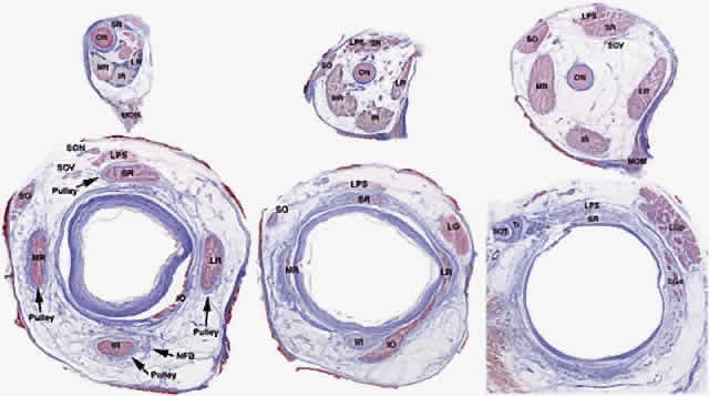 form sheaths as the EOMs penetrate posterior Tenon's fascia (see Fig. 5, lower left; Fig. 6). The SO muscle remains tethered to the periorbita via connective tissues