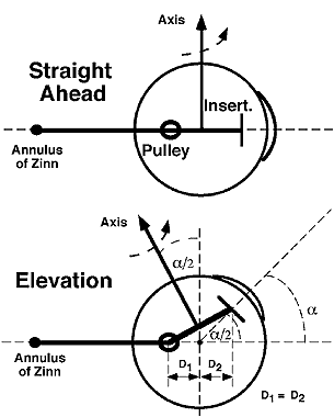 In addition to the precision of the static placement of the pulleys, they are also highly stable during even large gaze shifts (see Fig. 15).17 The MR pulley moves little with horizontal or vertical gaze. The IR pulley, because of its coupling with the IO pulley, is drawn nasally by IO contraction in elevation and moves temporally during IO relaxation during depression by connective tissue elasticity. The SR pulley is relatively stable in the mediolateral direction, for which is well supported by connective tissue bands and Whitnall's ligament running nasotemporally, but moves inferiorly in elevation as it is posteriorly displaced by the SR orbital layer, and superiorly in depression as the SR orbital layer relaxes. The vertical motion of the SR/LPS pulley is transmitted to the LR pulley via the LLA, causing the LR pulley to move superiorly during depression and inferiorly during elevation. The small, gaze-related shifts in rectus pulley positions are also highly stereotyped among normal persons. Recent improvements in MRI now make it possible to image rectus EOM paths anterior to the pulleys, even approaching the scleral insertions, in primary and secondary gaze positions. Reliable measures of rectus EOM paths can be obtained if data are averaged across multiple subjects. Such methodology demonstrates that rectus pulley inflections are discrete and shift with gaze, as suggested by the less rigorous EOM path data above. Figure 16 superimposes on a high-resolution axial MRI through the planes of the horizontal rectus muscles a graph of the vertical position of the LR path as measured at locations throughout the anteroposterior extent of the orbit. The graph, which is horizontally to scale with the MRI image, shows a straight-line path of the LR in primary gaze. However, in elevation and depression, there is a discrete inflection in the LR path at the point corresponding to the LR path inflection seen in the axial MRI image. The LR inflection point moves slightly superiorly in elevation and slightly inferiorly in depression. The stereotypic structure and intricate properties of the pulleys suggest that they are important to ocular motility. The pulleys function as the mechanical origins of the EOMs and play a vital role in ocular kinematics, the rotational properties of the eye. Because rotations are not mathematically commutative, final eye orientation depends on the order of rotations.18 Each combination of horizontal and vertical eye positions could, for an arbitrary 3D object, be associated with infinitely many torsional positions.19 The eye is constrained in its torsional freedom (with the head upright and immobile) by a relation known as Donder's law, stating that there is only one torsional eye position for each com-bination of horizontal and vertical eye positions.1 Listing's law, a specific case of the more general Don-der's law, states that any physiologic eye orientation can be reached from any other by rotation about a single axis, and that all such possible axes lie in a single velocity plane, Listing's plane. Listing's law is satisfied if the axis of ocular rotation shifts by exactly one half of the shift in ocular orientation for any eye movement.20 This is the so-called Listing's half-angle rule. Normal pulleys form a natural mechanical substrate for Listing's law and other aspects of ocular kinematics, and they render ocular rotations effectively commutative.21 Figure 17 is a lateral view of a diagrammatic globe showing a horizontal rectus EOM. The rotational axis of the EOM is perpendicular to the line connecting its pulley with the scleral insertion. Thus, the rotational axis of the horizontal rectus EOM is vertical in straight-ahead gaze. Now consider the situation during visual fixation of a horizontally centered target at angular elevation α. If the distance from the pulley to globe center D1 is equal to the distance from the insertion to globe center D2, then the rotational axis will tilt posteriorly by approximately angle α/2, as required by Listing's law. In tertiary (oblique) gaze positions, pulley behavior can still explain Listing's law, as illustrated in Figure 18, a top view of a schematic orbit showing the MR and LR muscles. Starting in primary position in the upper panel, the secondary positions of elevation and depression can be attained in conformity to Listing's half-angle rule, as explained above, if the distance from the pulley to globe center D1 is equal to the distance from the insertion to globe center D2. Starting in adduction, the tertiary positions of adducted elevation and adducted depression can be attained in conformity to Listing's law once again if the distance from pulley to globe center D1 is equal to the distance from insertion to globe center D2. Distances D1 and D2 are referenced to the globe, not relative to the orbit. To implement Listing's law, shifts in the anteroposterior position of the pulleys relative to the orbit must occur when beginning in the secondary positions of abduction, elevation, or depression, and moving into tertiary positions. Such anteroposterior shifts in pulley positions in secondary gaze positions are readily demonstrated by MRI (see Fig. 13). The SO muscle courses anteriorly from its origin about 40 mm and passes through a U-shaped plate of fibrocartilage, the trochlea, measuring 4 mm wide by 6 mm long.22 With the globe in primary position, the SO becomes tendonous about 10 mm posterior to the trochlea. The trochlea is attached to the superonasal orbital wall about 5 mm posterior to the superior medial angle of the orbital margin and about 10 mm from the medial border of the SR in primary position. A connective tissue sleeve enveloping the SO tendon thickens just posterior to the trochlea and inserts on it, whereas the tendon passes through the trochlea without a true synovial lining. Within the trochlea, the SO tendon has a diameter of only 1 to 2 mm. In primary position, the path of the SO is deflected by t