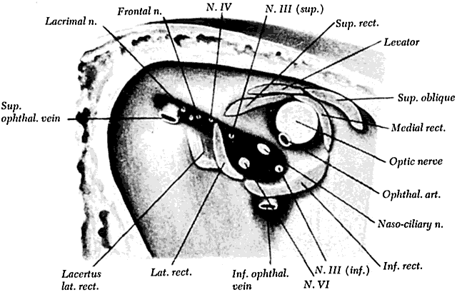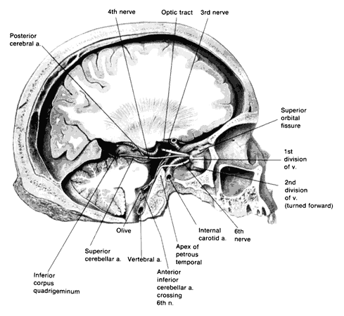 | The third, fourth, and sixth cranial nerves innervate six extraocular muscles. These muscles are responsible for controlling the ocular rotations in horizontal, vertical, and torsional directions. The third cranial nerve also provides parasympathetic motor innervation to the intrinsic eye muscles, the ciliary muscle, and the iris sphincter muscle. Although these nerves originate at separate locations in the brain stem, they converge in the subarachnoid space and become closely associated in the cavernous sinus, superior orbital fissure, and posterior orbit (Fig. 1). From the cavernous sinus to the eye, they may be involved simultaneously in pathologic processes. |