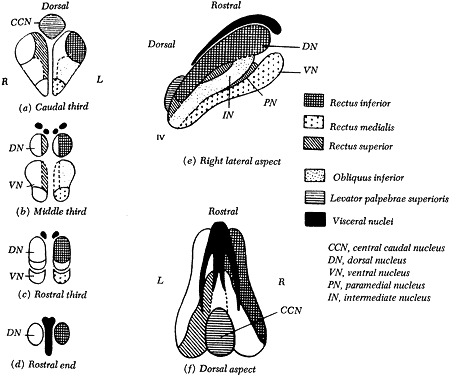 NUCLEUS The oculomotor nerve is the largest of the ocular motor nerves. It contains some 15,000 axons, including motor fibers and parasympathetic motor fibers. The nucleus of the third cranial nerve is located in the inferior periaqueductal gray matter of the mesencephalon. It is a complex of both paired and midline motor cells. These cells are found from the posterior commissure superiorly to the pontomesencephalic junction caudally (Fig. 2) in the dorsal midbrain. Classically, this complex has been described with four paired subnuclei supplying innervation to the inferior, medial, and superior rectus muscles and to the inferior oblique muscle. There is a single caudal, dorsal midline nucleus providing innervation to the levator muscle. Innervation of the extraocular muscle from the paired nuclei is ipsilateral for the inferior and medial rectus muscles and the inferior oblique muscle. However, innervation of the superior rectus is contralateral. The motor fibers to the superiorrectus decussate within the third nerve nucleus and join the fascicle of the contralateral oculomotor nerve.