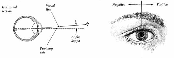 Both the Hirschberg and Krimsky tests have substantial limitations, the most significant of which is lack of interobserver consistency. A study11 comparing estimates of strabismic angle among 16 very experienced strabismologists found wide variability, especially using the Hirschberg method for larger angles, whereas underestimates were commonly produced. In general, the Krimsky test was more accurate than the Hirschberg test, although it was accurate less than 50% of the time. Another study12 found significant underestimation of the strabismic angle using the Krimsky method, but the amount of underestimation varied with the observer. Perimeter Method. The perimeter method requires the patient to steadily fixate the zero mark on the perimeter with the preferred eye while the examiner moves an examining light and his aligning eye together along the back side of the perimeter arc. At the point on the arc where the corneal reflection of the light appears located in the pupillary center of the deviated eye, the perimeter arc marking measures the squint angle in degrees (Fig. 5). Major Amblyoscope Method. The amblyoscope is basically a refined haploscopic device that originally consisted of a median septum between the two eyes plus angled mirrors that reflected separate targets into each eye. The present-day amblyoscope, instead of using a septum and mirrors, has a separate tube for each eye with a housing at the distal end of each tube in which it is possible to insert an assortment of targets to be observed individually by each eye. Further refinements, such as separate illumination of each target that is capable of being varied by rheostats and tubes that are mounted so they can be deflected in any plane and the quantity of deflection read directly from calibrated scales, make this instrument a major amblyoscope. Adjusting the tubes so that the corneal reflections of the illumination within the target housing is centered in each pupil (Fig. 6) gives the examiner a direct reading of the patient's misalignment from the instrument's scales. Regardless of which corneal reflex technique is used, consideration must be given to the angle kappa. Because the fixation axis of the eye is not usually the exact center of the pupil, the corneal light reflex is not centered and is usually slightly nasal to the center of the pupil.3 The angle formed by an imaginary perpendicular line through the true pupillary center and the fixation axis is the angle kappa (Fig. 7). A nasal angle kappa is designated as positive and a temporal angle as negative. It can be measured by any one of the preceding methods. Corneal light reflex testing will demonstrate only the manifest portion of the deviation. Because fusion is not disrupted, the phoria component will be hidden. A situation in which a grossly positive angle kappa may be encountered is with the retinal dragging associated with retinopathy of prematurity. Because the macula may be displaced temporally, the fixation axis of the eye may be displaced even more from the papillary axis, creating a pseudoexotropia. Both horizontal and vertical misalignments can be studied by the corneal reflex methods, but the examiner is unable to use these methods in the study of the cyclodeviations. DISSIMILAR IMAGES TESTS. The same fixation target, which is simultaneously presented to each eye, is converted into dissimilar images on the right and the left retina for the purpose of making fusion difficult or impossible. The Maddox rod test and the red glass test are two commonly used testing methods based on making the one object of regard project as dissimilar retinal images. Both tests are of value in assessing alignment only if the status of the retinal correspondence is known. Maddox Rod. The Maddox rod is a ribbed lens, the “washboard” appearance of which converts a spot of light into a streak. The streak is seen by the patient 90° away from the axes of the multiple cylinders. The rod is placed before one eye as the other eye continues to fixate the small spot source of light; a streak is seen to pass through the light if there is no deviation in the plane being tested. A horizontal streak (ribbing of the Maddox rod is vertical) checks vertical plane alignment (Fig. 8), and a vertical streak (ribbing of the Maddox rod is horizontal) checks the horizontal plane alignment. If the streak appears displaced away from the light, a misalignment exists. Whether the misalignment is a phoria or a tropia cannot be determined because fusion is precluded in this test. In the horizontal plane testing, a homonymous diplopia indicates esodeviation, and heteronymous diplopia indicates exodeviation. In the vertical plane testing, the streak seen by the hyperdeviated eye appears lower than the light and vice versa for the hypodeviated eye. Prisms are used to eliminate the horizontal or vertical diplopia, yielding a direct measure of the deviation if the retinal correspondence is normal. Cyclodeviations can be checked by placing a Maddox rod, preferably one red and the other white, before each eye at the same axis setting for each eye. If the axes of the two Maddox rods are set at 90 (Fig. 9), the red and white streaks appear on different axes in cyclodeviation. By adjustment in the axis settings of the two Maddox rods they are made to appear parallel; thus the degree of cyclodeviation can be determined.