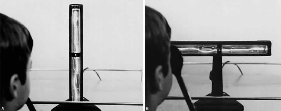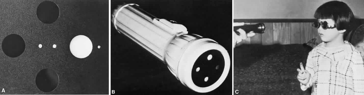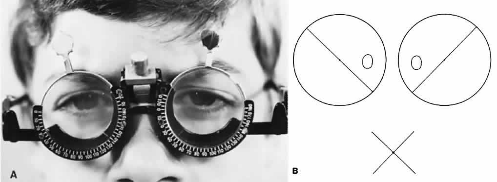 The Bagolini striated lens test requires a degree of maturity that is seldom found in a child younger than 8 years of age. Describing or drawing the suppression scotoma gap in one of the streaks presents great difficulty to the young child. MAJOR AMBLYOSCOPE TEST Fusion is investigated with the major amblyoscope by placing appropriate fusion targets in the housing of each tube and adjusting the instrument to project the similar images onto corresponding retinal areas of each eye. The fusion targets are identical except for one detail. For example, the target may be a clown that is identical in every detail on the right and left slides except that the hat is lacking from the right slide and the cane from the left. The report that the clown has both the hat and the cane indicates fusion. It is a great advantage that the tubes of this instrument can be adjusted according to the strabismus angle, enabling the targets to project onto corresponding retinal areas. After the presence of sensory fusion has been ascertained with this instrument, further testing is natural to investigate the motor aspect of fusion by determining the fusional vergence amplitudes. The technique for this determination is described elsewhere in these volumes. Retinal correspondence in a strabismic patient is also investigated on the major amblyoscope. For this test, the targets must be dissimilar—for example, a fish and a bowl. If the patient has binocular vision, the dissimilar images projected on each retina are simultaneously perceived. The tubes are set at the objective angle (the adjustment that compensates for all refixation movements of the eyes as the tubes are alternately illuminated while the center of each target is alternately fixated), which measures the angle of the strabismus. Next, the patient is asked to adjust the tubes so that the targets appear superimposed; this reveals the subjective angle. Objective and subjective angles that are identical indicate NRC; those that are dissimilar indicate ARC. A subjective setting of zero by a strabismic patient is harmonious ARC, indicating that the cortical adaptation of ARC fully compensates for the angle of strabismus. A subjective angle that is somewhere between zero and the objective angle is unharmonious ARC, indicating that the cortical adaptation of ARC does not fully compensate for the angle of strabismus. Actually, the ARC patient usually experiences some difficulty in superimposing the targets at the subjective angle (e.g., as the patient approaches the lion toward one end of the cage it suddenly disappears, only to reappear as it leaves the other end of the cage) because of the suppression scotoma coexisting with ARC. The advantages and disadvantages of the major amblyoscope test should be described. The advantages are (1) the tubes can be adjusted to compensate for the combined horizontal, vertical, and torsional deviations of the eyes; (2) the fusional vergence amplitudes are readily measurable for each of the three planes; and (3) enhancement of their amplitudes may be treated on this instrument. The disadvantages are that the instrument induces convergence despite the 5-diopter lens in the viewer's end of the tubes and that the distance between lens and target in the housing is 20 cm. Awareness by the patient that the target is near induces accommodation, which is associated with accommodative convergence. The result is that the convergence induces either greater esodeviation or less exodeviation than the prism and alternate-cover measurement that were obtained while the patient viewed an actual distant target. Second, although stereopsis or its absence is ascertainable on this instrument, measuring the stereoacuity accurately is nearly impossible. Third, the concepts regarding binocular vision that have evolved around this instrument are inaccurate and pervasive. The three grades of fusion described by Worth1 (i.e., simultaneous perception, fusion, and stereopsis) create a barrier for understanding binocular vision because neither simultaneous perception nor stereopsis are fusion. Also, the finding of ARC not matching the objective angle of the strabismus deviation, creating the classification of harmonious and unharmonious ARC, can be proved inaccurate by the Bagolini striated glasses test. The essential difference is that viewing through Bagolini striated glasses discloses only harmonious ARC. The laboratory test of viewing through tubes—without peripheral vision clues—rather than viewing in real space confuses the patient, leading to the artifact of unharmonious ARC. RED FILTER TEST Fusion is tested by viewing a muscle light with both eyes while a red filter is maintained in front of one eye. A nondiplopic response and a report of a pink light suggest macular fusion. Individually, one eye sees the light as white, whereas the other sees it as red, but in accordance with the laws of color fusion, the fused perception is a pink tint. Scotoma is tested for by placing the red filter in front of the nonfixating eye. A report that only the white light is seen suggests that the red image is projecting within the scotoma. The alignment of the eyes determines the retinal locus from which the scotoma projects. In patients with straight eyes or in those whose deviation by simultaneous prism and cover is 8Δ or less, the scotoma includes the macula; in strabismic patients with greater deviations, the scotoma projects from an extramacular region. Size and profoundness of the scotoma are investigated next. The nasal scotoma in esotropia is about 5° to 6°, whereas the temporal scotoma in exotropia is usually larger and extends up to the hemiretinal line. The depth of the scotoma may vary from slight to profound. Rapidly covering and uncovering the eye with minimal suppression for just a few moments may be sufficient to produce appreciation of diplopia. If suppression persists despite flashing of the occluder, the examiner introduces a 15Δ base-up or 