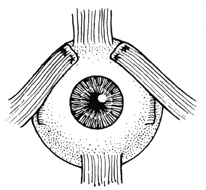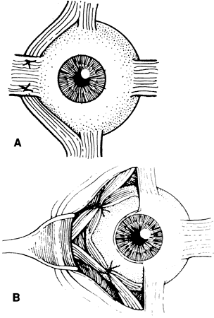 If contracture of the direct antagonist is present, as manifested by its obvious overaction, and the vertical tropia is concomitant for upgaze and downgaze with the side of the vertical field of action of the palsied muscle, weakening the direct antagonist should be the first procedure. Otherwise, in the absence of obvious contracture, one may weaken the yoke of the palsied muscle or tuck the palsied muscle as the first procedure. In general, the longer the duration of the strabismus, the greater is the likelihood of contracture of the direct antagonist. Knapp has provided a classification and treatment scheme for superior oblique palsy.75 In class 1, the superior oblique palsy is found where the greatest deviation is in the field of action of the direct antagonist inferior oblique muscle. Treatment consists of weakening the antagonist inferior oblique muscle. In class 2, the greatest hypertropia is in the opposite and down oblique field, the field of action of the paretic superior oblique. Knapp recommends a tuck of the superior oblique as the method of first choice or, if there is difficulty in finding a superior oblique tendon or if there is little or no head tilt, recession of the yoke inferior rectus. In class 3, hypertropia has spread upward from the field of action of the paretic superior oblique because of overaction of the direct antagonist inferior oblique muscle. If the deviation is 25PD or less, inferior oblique weakening or a superior oblique tuck is recommended. If the deviation is greater than 30PD, a weakening of the inferior oblique muscle plus a graded tuck of the paretic superior oblique or a graded recession of the yoke inferior rectus is recommended. In class 4, the deviation is the same as in class 3 except for an additional hypertropia across the lower field of action because of underaction of the synergist inferior rectus muscle. Knapp recommends performing the same surgery as in class 3 but postponing the correction of the hypertropia in the field of a synergist inferior rectus because of possible spontaneous improvement. If the hypertropia does not improve, a resection of the inferior rectus is recommended. In class 5, the greatest hypertropia is across the lower field, also described as double depressor paresis. If the deviation is 30PD or more in the lower field, Knapp recommends a tuck of the paretic superior oblique and a tenotomy of the fellow superior oblique muscle. In class 6, bilateral superior oblique palsy, Knapp initially recommended a tuck of each superior oblique muscle along with infraplacement of the medial recti because of the V pattern. At present, the Harada and Ito modification produces a more satisfactory correction of the excyclotropia.72 In class 7, traumatic paresis plus restriction of relaxation of the superior oblique, also known as the canine tooth syndrome because it is most frequently caused by a dog-bite injury to the trochlear area, requires surgery to correct the Brown syndrome first, with a subsequent attempt at correcting paresis of the superior oblique if possible. Tightening of the palsied muscle does not make it normal. Mechanical improvement is obtained in the primary position, but there is still deficiency in the field of action of the paretic muscle. If the tuck is performed, it should be performed temporal to the superior rectus muscle. Performing the tuck at this site diminishes the restriction of elevation in adduction (simulated Brown syndrome) but does not entirely relieve it; the restricted elevation usually gradually improves. Therefore, some surgeons are less than enthusiastic about tucking the paretic superior oblique tendon unless further surgery is required after the yoke has been recessed. The quantity of tendon tucked is 10 mm or more, depending on how easily it stretches on the instrument used for tucking. Recessions of the inferior oblique muscle are usually 10 mm76,77; if the overaction is marked, recession may be increased to 14 mm. Denervation and extirpation of the inferior oblique may be necessary for extremely marked overaction of the inferior oblique muscle, because inferior oblique recession may not provide sufficient weakening.78 Recessions of the inferior rectus muscle range between 3 and 4 mm; if the vertical deviation in the primary position is 10PD or more, the maximum recession is performed. Maximum recession causes approximately 1 mm of sclera to show peripheral to the 6-o'clock limbus position. There are many exceptions to the above recommendation of which muscle should be operated on first; the most notable exception is a patient with minimal palsy of the superior oblique muscle with no direct antagonist contracture. Tucking the superior oblique tendon yields greater benefit in this patient than in a patient with maximal paralysis of the superior oblique muscle. Helveston and Ellis performed the superior oblique tuck procedure with additional muscle surgery, when indicated, in 59 patients, according to Knapp's classifications 2 through 6,79 17% required surgical reversal of the tuck because of torticollis, vertical or torsional diplopia, or tightness of elevation in adduction. Superior oblique resection has been advocated by Anderson and coworkers because of recurrence of hypertropia secondary to failed tucking procedures.80 In addition to inferior oblique muscle surgery, Khawam and associates recommended vertical rectus muscle surgery if the vertical deviation exceeds 15PD in the primary position.56 When the vertical deviation is greater in straight-up gaze than in straight-down gaze, ipsilateral superior rectus weakening has been recommended, in addition to inferior oblique weakening. When vertical deviation is greater in downgaze than in upgaze, recession of the yoke muscle, the inferior rectus of the fellow eye, has been advocated. The recommendation of superior rectus recession ipsilateral to the palsied superior oblique muscle contrasts with the view taken by other surgeons who recomme