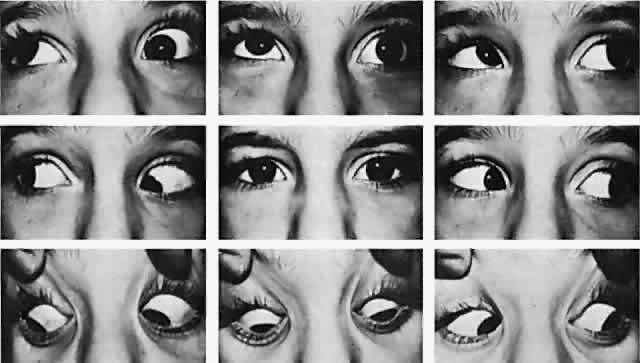 have been reported.160,161 Deletion of chromosome 13 in two reports162,163 suggests that the Moebius gene is located in the region of chromosome 13. Esotropia and inability to abduct the eyes are the usual reasons for the patient to be referred to an ophthalmologist. Horizontal versions are lacking, but vertical version and convergence are intact (Fig. 3). Because of the inability to move the eyes horizontally in response to horizontal version stimulation, the patient may maintain fixation of the laterally moving target by voluntarily converging. Pupillary constriction and increasing accommodation occur as the voluntary convergence increaseswhile the patient visually tracks the target farther and farther into either right or left gaze. Normal reading despite limited eye movements has been reported in two patients with Moebius syndrome, suggesting that normal eye movements are not required for the development of reading skills, and that efforts to normalize eye movements in poor readers by vision therapy may be misdirected.164