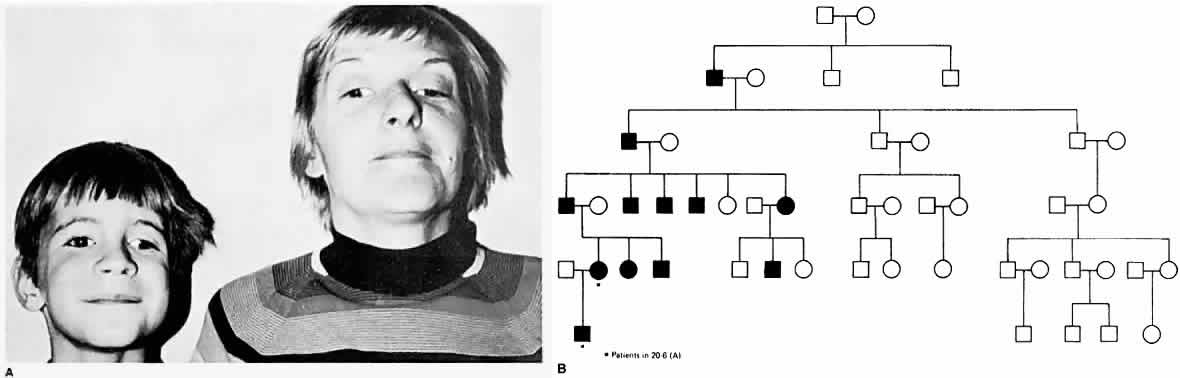 the telomere of the long arm of chromosome 16.190 GENERALIZED FIBROSIS SYNDROME Brown191 first used the description of general fibrosis syndrome while reporting 3 sporadic cases with complete bilateral ptosis and fibrosis of all extraocular muscles. There were adhesions between the globe and Tenon's capsule, so that depression and elevation of the eyes was not possible and lateral motion was extremely limited. All muscles, including the levator muscle, tend to be involved in this bilateral syndrome, although the muscles of one eye may be more involved than those of the other. Some muscles may be minimally fibrotic whereas others are maximally involved. The inferior rectus muscles are usually the most prone to maximal involvement, causing the eyes to be drawn downward and offering resistance to elevation in abduction and midline. Ptosis is associated with the motility defect in the eye, although a case of unilateral congenital fibrosis syndrome has been reported, presenting with hypertropia and minimal ptosis.192 Horizontal movements of the eye may be limited to a few degrees in one or both directions or there may be no horizontal movement. Because of the downturned fixed po-sition of the globes, the patients usually adopt achin-up position to fixate straight ahead centrally. This is a dominantly inherited condition179,182,193–195 affecting multiple family members (Fig. 6), it but may also be sporadic.194,195 Amblyopia may occur and is treated with occlusion when appropriate.179