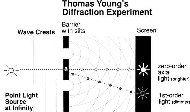 The wave theory also explained why a parallel beam of light seemed to diverge slightly as it passed through a small hole, and why light striking an opaque object cast shadows with indistinct edges. Recall that Huygens pictured every point on a wavefront as a potential source of a series of waves in all directions, if the wavefront interacted with an obstacle. Thus, as a beam of light goes through an aperture, all the diverging wavelets are cancelled out by their neighbors to the right and left, and only the forward-directed waves are left, with one exception: the edges of the wavefront. At the right end, a right-sided wave has no right-sided neighbor on its extreme side. Thus, the edge of the beam veers sideways. It is almost as though the edge ray meets a friction between its one side and the edge, causing an apparent drag that forces the ray to veer off course. Again, the size of the wavelength is related to this edge effect: the longer the wavelength, the greater the diffraction. This phenomenon is exploited to produce the wide spectrum of colors in modern spectroscopes. A series of closely placed slits (thus yielding many edges) in the form of a diffraction grating produces a vivid spectrum in which red is bent the most and violet is closest to the center. This spectrum is the reverse of that produced by a prism, in which the shortest wavelength (violet) is refracted the most. The edge effect can be a problem in photography, when a large f number (small iris opening) is used to yield a greater depth of field or, as we will see, when the pinhole disc is used to improve visual acuity. |