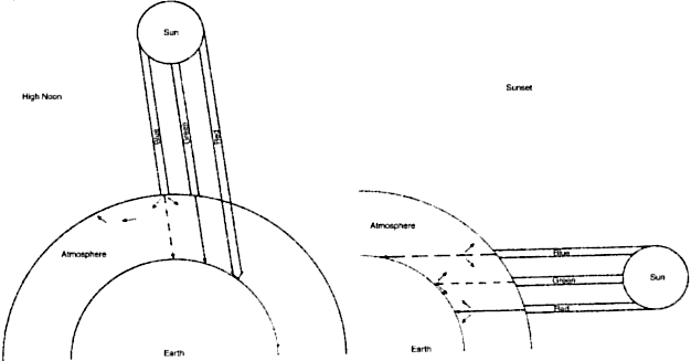 DEFINITION Picture a shaft of light piercing a dusty room. The physicist sees each dust particle as an agglomerate of many atoms and molecules. These, in turn, are composed of negatively charged electrons and positively charged, heavy nuclei. When a stream of photons is absorbed by a dust particle, the electric field in the light beam can be pictured as exerting an oscillating force on both the nuclei and the electrons. The heavy nuclei remain unmoved, but the electrons are displaced from their normal orbits and move rapidly back and forth in synchrony with the driving electric field of the light beam. In so doing, light waves are radiated in all directions. The observer sees the shaft of light because his eye detects the sidewise-scattered light from each particle. If the room were clean of all dust or scattering particles, the beam would be invisible to the observer. The situation becomes a bit more complicated when the scattering particles are spaced closer together than dust in a room. Certainly, each scattering element radiates light waves in all directions, and the total scattering is the sum of all the waves. But here is where a complication arises. Waves may add constructively or destructively. At any one observation outpost, the net amount of light reaching that point is determined by the sum of the constructive and destructive interference of all waves crossing that point. Let's stop for a moment for a definition. The quantity that describes what point each wave is in its oscillation cycle is called the phase of the wave. The key concept in this definition is that the difference in phase between waves depends, in part, on the spacings of the scattering particles in comparison to the wavelength of light. If, for example, two scattering particles are spaced by distances comparable to one half the wavelength of light, the two scattered waves will be 180° out of phase and the waves will then cancel each other, giving no electric field at the observation point. If, however, two particles are spaced at distances that are small in comparison to the light wavelength, the phases will nearly be the same, and the scattered field will have an amplitude twice as large as each wave individually. Therefore, the final summation of all scattered waves will give a result that depends both on the relative positions of each scattering particle in comparison to the wavelength of light and on the direction of the scattered waves. For example, light is completely transmitted through a transparent medium such as water because the water molecules are tightly packed. This means that all the waves scattered sideways from each of the molecules travel a longer distance and are out of phase with each other and thus interfere destructively with one another in all directions, except the forward direction. In water, side-scatter is eliminated, but forward-directed light waves reinforce each other because their straight-ahead paths have similar lengths. Another factor important in scattering is the overall regular arrangement of the scatterers. For example, the lens of the normal eye is made up of protein and physiologic fluid. The lens proteins are tightly packed in an orderly fashion, and there is very little change in the density of the scattering particles from point to point in the lens. Thus, the lens is transparent. If a clear lens homogenate is mixed with water, the proteins are dispersed and the density of the proteins fluctuates markedly, producing a random pattern. The result is a great deal of scattering and a milky-appearing solution. In summary, the relationship between the size of the wavelength of light involved, the spacing of the scatterers, the size of the scatterers, and their arrangement determines the total scattering from a medium. This interaction is analogous to running one's finger over a smoothly polished surface. The surface feels smooth if the irregularities are small in amplitude and are spaced by distances that are small in comparison to the spacing between the pressure-sensitive receptors on the fingertips. The sense of touch has a certain resolving power and cannot respond to small-scale fluctuations. In the case of light and scattering, if the scattering medium has periodic fluctuations in arrangements of scattering components larger than the wavelength of light, then these can be sensed by light waves and scattering can occur. If the spacings of the scattering components of the media are shorter than one half the light wavelength, little scattering can occur. It is time, now, to apply our theoretic understanding of light scattering. However, in order to explain some natural phenomena we will need to cover one more theoretic point. Lord Rayleigh showed that when light strikes atmospheric particles (particles smaller than the wavelength of light), the amount of light scattering is inversely proportional to the fourth power of the wavelength. Since the blue end of the spectrum is half the wavelength of the red end, the blue end is scattered by a factor of 24 or 16 times the amount of the red end. This seems logical, since small particles should interact more completely with smaller wavelengths. At high noon, the sun's rays pierce the atmosphere in a perpendicular fashion (Fig. 4). Thus the shorter wavelengths of the sun's spectrum are more heavily scattered by the atmospheric particles, which splash the color blue all over the sky. This takes some of the blue away from the sun's own appearance, and it looks yellowish. At sunset, the light strikes the atmosphere at an angle and thus must travel a longer distance through the atmosphere (see Fig. 4). The additional particles scatter not only blue but also a significant amount of the longer wavelengths, and the sun's color goes from yellow to orange to deep red. When you look at the lens of an elderly patient through the slit lamp, you will notice that the reflection from the anterior capsule is blue-white, whereas the reflection fr