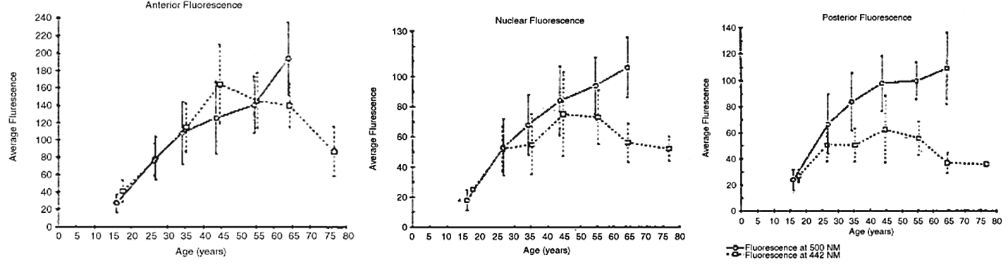 and converting it into the less energetic green or yellow light. How is fluorescence related to the eye? The fluorescence of fluorescein dye is a good example (Fig. 18). Another interesting example is the natural fluorescence of the crystalline lens. If the lens is excited with a nonvisible ultraviolet wavelength (say, 300 or 350 nm), a faint blue fluorescence will be observed. This is thought to be primarily related to the accumulation of tyrosine and tryptophane residues, and is responsible for the filtering effect of ultraviolet light as one ages. The increased tryptophane and tyrosine levels are thought to be related to oxidation of lens biomolecules. This oxidation may be driven, in part, by cumulative light exposure.