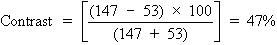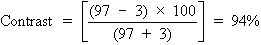 To calculate the contrast of the projected Snellen chart in a darkened room, let us say the background illumination is 97 arbitrary light units, and the target illumination (consisting of letters) is 3 light units. This gives the following: