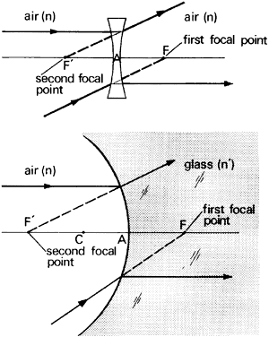 for positive elements (Fig. 5) and a virtual image point for negative elements (Fig. 6). Distance F'A is the second focal length. Light originating from the