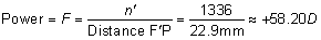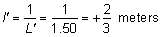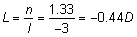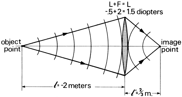 The image vergence becomes L' = -0.5 + 2 = + 1.5 D. This shows that the light leaves the lens with a convergence L' of 1.5 D and will be imaged in air at