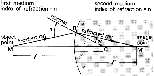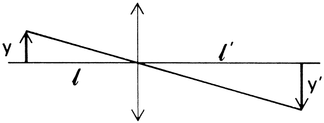 In the previous lens example, we found L = -0.5 D, and L' = + 1.5 D; consequently, the magnification is m = L/L' = -0.5/150 = -1/3. The image is one third as large as the object, and the minus sign means that the image is inverted. Similarly, in the previous example of a refracting surface separating water and glass, L = -0.44 D and L' = 0.24 D. The magnification is m = -0.44/0.24 = -1.83. |