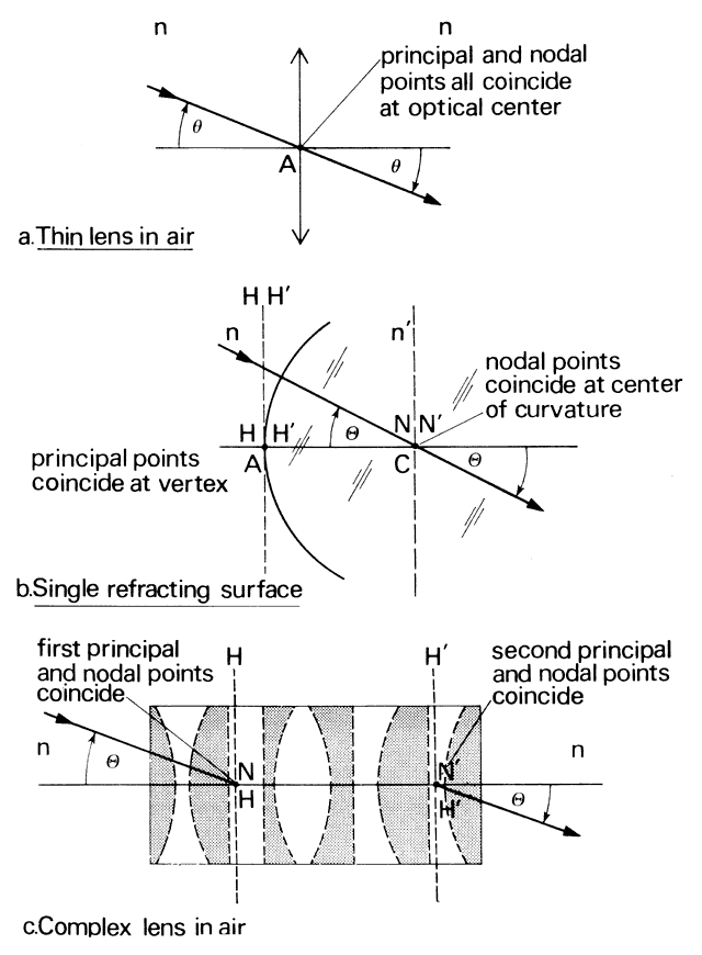 nodal points are called points of unit angular magnification. When both the object and image lie in a medium of the same index of refraction, the first and second nodal points coincide with the first and second principal points (Fig. 12c), a lens system surrounded by air. If the lens is a simple thin lens in a uniform medium, the principal and nodal points all coincide at the vertex of the lens (see Fig. 12a). If the image is not in the same medium as the object, as in the single refracting surface of Figure 12b, however, the nodal points do not coincide with the principal points. The two principal points coincide at the vertex of the surface, and the two nodal points coincide at the center of curvature of the surface. For all these cases, the slope of the ray directed toward the first nodal point is the same as the slope of the ray that appears to emerge from the second nodal point. The eye is a complex series of refracting surfaces that forms an image in vitreous of an object in air. Therefore, it has a pair of principal planes and a separate pair of nodal points that can be used to represent it. Their positions are shown in Gullstrand's schematic eye (Fig. 13). |