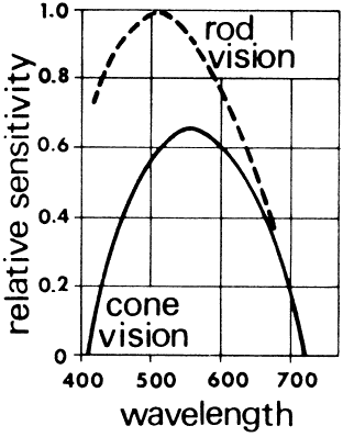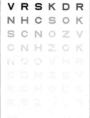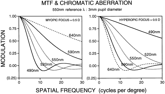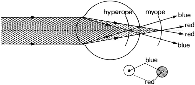is called the near-point of accommodation. The sequential occlusion of the two holes of the Scheiner disc can be used to find the refractive state of the eye. For example, the pencil of rays through the lower hole will strike the hyperopic retina below the axis and the myopic retina above the axis. The hyperope will note a disappearance of the upper image (opposite), and the myope will not see the lower image (same) when the lower hole is occluded. (Hint: project the retinal point back through the nodal point for the apparent direction of the same source.) Thomas Young (1773-1829) pioneered the investigation of the accommodative mechanism of the eye. Theoretically, the eye may change its focus in several ways. It may change its axial length. This is essentially how a camera is focused for near objects. The lens simply is moved farther from the film plane by means of a focusing ring built into the lens barrel or, in extreme close-up work, the lens is attached to a bellows that permits positioning the lens through a much greater range. A natural question, then, is whether the eye elongates to focus on near objects. A young emmetrope can focus easily on an object 10 cm from the eye. We can find the elongation of the eye required to place the retina in the image plane of this object with the vergence equation. The eye must elongate to 27.7 mm. When the object is at infinity, the position of the image was shown to be 22.9 mm, thus, the growth in axial length of the eyeball is 27.7 - 22.9 = 4.8 mm. This is a change in axial length of more than 20% of the emmetropic length of the eye, and it must be accomplished almost instantly, imperceptibly, and unflaggingly during the waking hours. Clearly, the human eye does not accommodate in this manner. Accommodation also may be mediated through an increase in the power of its refractive elements. The eye theoretically may increase its power through a shortening of the radius of curvature of the cornea or the lens or by an axial shift of the lens. Young did an experiment in which he immersed his eyes in water. By nearly matching the refractive indices at the water/cornea interface, he practically eliminated the corneal refractive power. He became an extreme refractive hyperope. To see distant objects clearly, Young introduced a positive lens to replace the lost corneal power and could accommodate for near objects. Thus, he showed that accommodation could be exerted despite the neutralization of the cornea. Although the crystalline lens remained the most logical agent of accommodation, the question to be resolved was whether the crystalline lens moved axially or changed shape. Axial movement was eliminated by the constraints on how much the lens could move within the anterior chamber. Calculations show that the depth of the anterior chamber is not sufficient for maintaining the focus of near objects. The steepening curvatures of the crystalline lens account for the ability to accommodate. Helmholtz concluded that the zonule maintains shallow lens curvatures in the unaccommodated state. Relaxation of the fibers, when the ciliary body constricts, allows the elastic capsule of the lens to assume a rounder form. Tscherning noted that the central portion of the lens became more deeply curved whereas the peripheral zone of the lens surface flattened during accommodation. He concluded that this occurred because of an increase in tension by the zonule during accommodation. It generally is accepted that Helmholtz is correct in concluding that relaxation of tension by the zonule allows the lens to assume a more deeply curved form. Fincham concluded that it was the nonuniform thickness of the lens capsule that caused the bulge in lens curvatures in accommodation rather than capsule elasticity.23 Gullstrand provides a radius of curvature of 10 mm for the anterior surface of the crystalline lens when relaxed and a radius of curvature of 5.33 mm when accommodated by nearly 10 D. The axial thickness of the lens slightly increases because of the forward bulge of the anterior surface. Mainly because of the bulge, the power of the lens increases from 19 to 33 D, and the power of the eye correspondingly increases from 58.64 to 70.57 D. STIMULUS FOR ACCOMMODATION The nature of the optical stimulus for reflex changes in accommodation has been debated for more than 50 years. The standard view is that accommodation is a closed-loop negative feedback system that alters focus to maximize or optimize the luminance contrast of the retinal image. In this view, contrast is reduced both for underaccommodation and overaccommodation, and feedback from changes in defocus blur is an essential part of the accommodative process. However, recent experiments confirm that accommodation responds in the absence of blur feedback13 and that the stimulus on the retina has directional quality that distinguishes myopic from hyperopic focus. Along these lines, Fincham29 suggested that accommodation responds directly to the vergence of light at the retina, using the effects of chromatic aberration and the Stiles-Crawford effect. At spatial frequencies above approximately 1 cpd, chromatic aberration ensures that the contrasts of long-, middle- and short-wavelength components of the retinal image are different. For example, the relative contrasts red>green>blue specify focus in front of the retina. In one model of the process, the refractive state of the eye is determined by comparing relative cone contrasts, measured separately by L-, M- and S-cone classes. In addition to the effects of chromatic aberration, the waveguide nature of directionally sensitive foveal cones could play a role in the accommodative process, but the notion remains largely unexplored. AMPLITUDE AND RANGE OF ACCOMMODATION When the eye is accommodated fully, the point in space conjugate to the retina is the near-point of the eye. It is the nearest point of distinct vision. How much accommodation is exerted from the relaxed state to