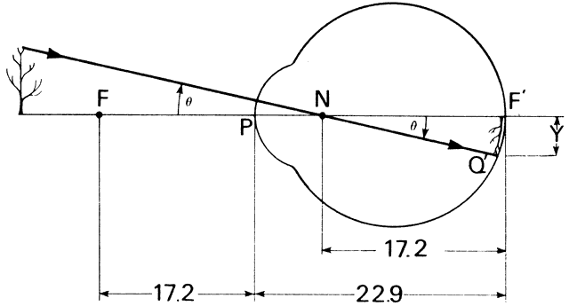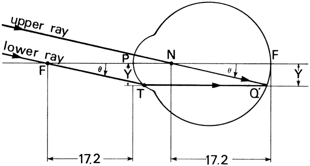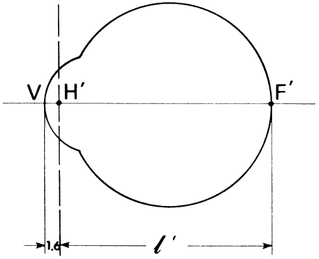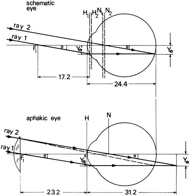 unequal images. Extraction of the crystalline lens reduces the power of the eye and changes the position of the far point. The dioptric far-point L of the aphakic eye can be found with the vergence equation L' = L + F where F = 43 D and the image distance from the cornea to the retina, l' must be 24.4 mm. Therefore, the image vergence is L' = 1336/24.4 = 54.75 D. Substitution in the vergence equation will result in 54.75 = L + 43. Thus, L = 11.75 D. The far-point distance is l = 1000/11.75 = 85.1 mm behind the cornea. Figure 79 compares the optical systems of the schematic and aphakic eyes. In the