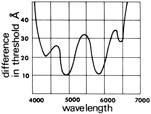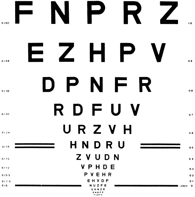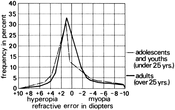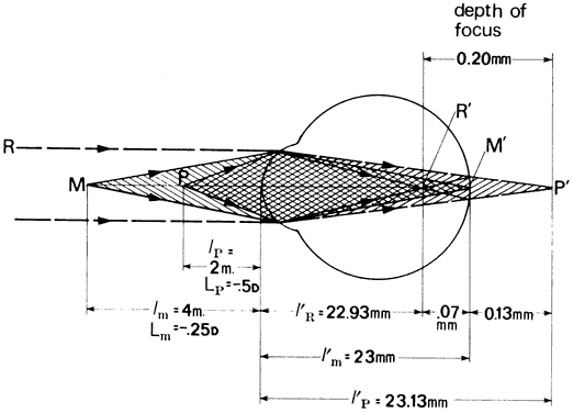 The emmetrope's far-point r is at infinity, therefore, R = 1/∞ = 0. Substitution into the equation R - P = A, results in 10 = 0 - P, or the dioptric value of the near-point is P = -10 D. This corresponds to a near-point distance p = 1/P, or p = -1/10 meter = -10 cm. The emmetrope's range of accommodation is from 10 cm in front of the first principal plane of the eye to infinity. The hyperope has a far-point R = + 5 D, that is, the far-point distance r is 1/5 meter behind the eye. P = R - A = 5 - 10 = -5 D. The near-point distance p is one fifth of a meter in front of the eye. In effect, 5 D of accommodation were exerted to overcome the hyperopia, to see sharply at infinity, and the remaining 5 D determined the near-point. The range of accommodation of the hyperope is from 20 cm in front of the eye, through infinity, to 20 cm behind the eyes (see Fig. 81). The dioptric value of the far-point of the 5-D myope is R = -5. Thus, P = -5 - 10 = -15 D. The range of accommodation of the myope is a = p - r = -100/15 + 100/5 = -6.7 + 20 = + 13.3 cm, or from 6.7 cm to 20 cm in front of the eyes. These examples illustrate the limited range of accommodation available to the myope who otherwise has an amplitude of accommodation equal to that of an emmetrope and hyperope. |