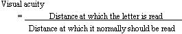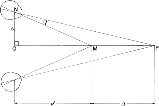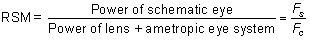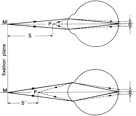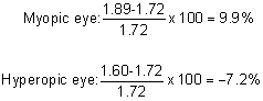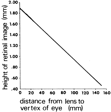 The power of the lens combined with the aphakic eye is 11.75 + 43 = 54.75 D, which corresponds to a focal length of 18.3 mm. The size of the retinal image is the product of focal length multiplied by the angle subtended by the object or 18.3 × 0.1 = 1.83 mm. The RSM = 1.83/1.72 = 1.064 or + 6.4% when the lens is at the cornea, as is a contact lens. If the aphakia is monocular and the other eye is emmetropic, the RSM of 35% and 6.4% also will be equal to the aniseikonia induced by a spectacle and contact lens correction, respectively. |