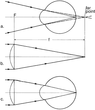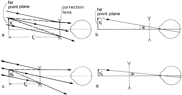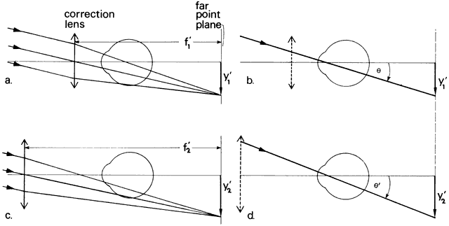 Usually, the closer a lens is fitted to the refractive ametrope, the less magnification there will be. The magnification effects for a correction lens at the first focal point of the eye compared with a contact lens are summarized in Table 7. RELATIVE SPECTACLE MAGNIFICATION AND ANISEIKONIA Aniseikonia is produced by RSM in anisometropia. For example, let the myopic conditions of Table 7 apply to the right eye and let the left eye be emmetropic. The left eye retinal image size of a 0.1-radian target will be 1.72 mm. Axial myopia corrected at the first focal point results in a 1.72-mm image. Refractive myopia that is corrected with a lens in contact with the reduced eye also results in a 1.72-mm image. These right eye corrections produce no aniseikonia or RSM. However, the axial myopia correction at the eye produces a 1.89-mm image. This results in + 9.9% aniseikonia and RSM. Similarly, the refractive myopia correction at the first focal plane produces a 1.59-mm image or -7.6% aniseikonia and RSM. |