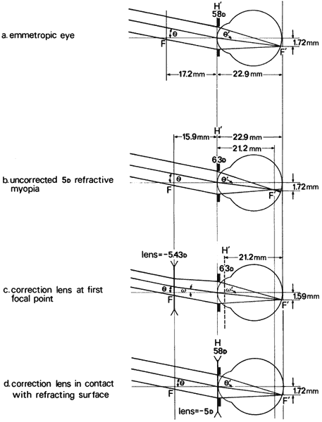 Thus, the size of the corrected image in aphakia compared with the size of the emmetropic image, or the relative spectacle magnification is