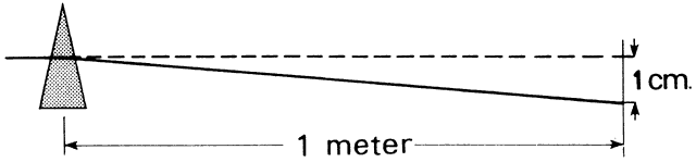 of the reading matter will be greater for one eye than the other. Prismatic effect is calculated according to Prentice's rule, which states that prismatic deviation is equal to the lens power multiplied by the distance off-center through which the line of sight passes. P = dF, where P equals deviation in prism diopters, d equals the off-center distance in centimeters, and F equals the power of the lens in diopters. A prism diopter (Δ) is a measure of ray deviation given by a linear displacement in centimeters on a screen placed 1 meter from the prism (Fig. 77). A displacement Y of 1 cm at 1 meter equals 1Δ. An example of an induced vertical imbalance follows for the following prescription: OD = + 1 D; OS = + 3 D. The corresponding prismatic effects for a line of sight 1 cm below the optical centers are POD = 1 × 1 = 1Δ base-up and POS = 1 × 3 = 3Δ base-up. The vertical imbalance is 3 - 1 = 2Δ base-up on left eye.
