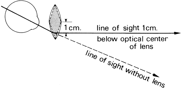 Light is deviated toward the base of a prism. In the aforementioned example, the prism is base-up because a plus lens is thickest at the optical center and the line of sight passes 1 cm below the center (Fig. 78). Myopic corrections induce base-down prismatic effects when the line of sight is depressed because minus lenses are thickest at the edge. Vertical disparities are poorly tolerated. They may cause reading problems because of difficulties in maintaining single binocular vision. Ultimately, suppression of vision in one eye may result.
