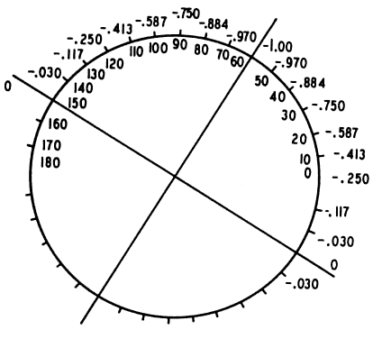 The sine of 0° is 0, the sine of 90° is 1, and the sine of 180° is once again 0. Between 0° and 90°, the values of sine increase from 0 to 1; they show a corresponding decrease between 90° and 180°. The sines of angles from 0° to 180° may be plotted on a graph, as shown in Figure 3 (the round points), and give rise to the sine curve. Many wavelike or cyclic phenomena may be described by a sine curve. In our current example, the changing powers of a cylindric lens seem to follow this curve.