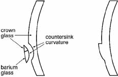 lenses. The shapes of the bifocal segments in the market today are essentially the same as those reviewed above from a historical perspective. All bifocals were initially developed in glass, today glass has a small market presence and most bifocals are made from plastic, polycarbonate, trivex or other resin materials. By far the most commonly prescribed bifocal is the flat-top (FT) or D segment, directly derived from the Univis “D” segment developed in 1926. (There were also segment shapes designated “A–C” that were not as successful.) In glass products, then as today, the segment is formed by fusing a segment of barium glass (index of 1.623) to a crown glass (index 1.523) carrier lens as shown in Figure 2. The countersink curvature is calculated to provide the intended add amount and to enable the front curvature of the segment to match the curvature of the carrier lens. This results in a smooth front surface and the bifocal junction is indistinguishable by touch. Note in Figure 2 that the countersink is actually circular and the flat top is created by making the top part of the segment out of crown glass which seamlessly blends with the carrier lens. All nonglass bifocals are of one-piece construction, meaning that the entire lens is made from the same material and that the power difference between the distance and near portions is created with changes in curvature. The segment is formed (molded) as part of the lens and the power addition is created with a different curvature (Fig. 2). Because the surface has a discontinuity it is readily identified by touch, this is, the top of the bifocal segment forms a small ledge.
