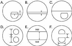 Available bifocal types are shown in Figure 1. The round segment (Figure 1A) has evolved from the Kryptok bifocal and classically has a diameter of 22 mm although other diameters are available. A chief advantage of round segments is that they are the least noticeable cosmetically, especially if a light tint (such as pink) is used. Disadvantages of the round segment are that image jump is fairly large because the distance from the top of the segment to the optical center of the segment is fairly large (i.e., half of the segment diameter). Also, because the top of the segment is curved, the top portion of the segment provides little width of near vision and is not very useful. This effectively enlarges the zone of unusable vision at the top of the segment. The 15 mm round segment is useful for patients engaged in activities such as golf or outdoor labor where a segment is considered bothersome yet the patient still requires some near vision. One successful solution for golfers is to use a monocular 15-mm round segment located superiorly or temporally on the same eye as the handedness of the golfer. Glasses with 15 mm round segments are usually for special usage and the patient will require a separate pair for other daily activities. FT bifocal segments (Fig. 1B), sometimes still referred to as “D”-type segments, lessen the problems of the round segment at the top of the segment. By eliminating the top of the circle, useful near-field width is attained immediately below the top of the segment line. Also, because the optical center of the segment for FT bifocals is 5 mm below the top line, the magnitude of the image jump is less than for round segments. FT bifocals have become the standard bifocal because of visual advantages, even though they are more noticeable cosmetically than round segments. FT28 is the most common width, however, other widths can be used dependent upon the visual needs of the patient. The Ultex-type bifocal (Fig. 1C) is characterized by very large amounts of image jump (the optical center is 19 to 20 mm below the segment top) and by limited distance zone in the lower portions of the lens. Because of these characteristics, the lens is not well-suited for general use. However, it is a very good lens for hyperopic patients who perform considerable near work such as at a desk. This is because the hyperopic patient obtains base-up prism with depressed gaze, hence re-quiring excessive depressed gaze to view typical near materials. Base-down prism from the Ultex bifocal counteracts the prism from the plus distance lens and reduces the amount of required gaze depression for near materials. The Ultex bifocal should be considered for this specialty use, but the large amount of image jump at the segment top and the minimal distance zone in the lower lens are detriments to prescribing the lens for general use. The Executive bifocal (Fig. 1D), sometimes still referred to as a Franklin bifocal, has the advantages of an extremely wide near-viewing zone and no image jump at the top of the segment because the optical center of the add is on the segment line. Despite these advantages, the lens is limited in scope because of the lack of any distance zone in the lower portions of the lens. This is very bothersome for ambulation and general daily wear. The lens is best suited to meet extensive near-viewing needs such as at a desk. However, many practitioners prefer to use a FT35 or FT45 instead for these purposes. The blended bifocal (Fig. 1E) is a variant of the round bifocal. The boundary between the distance and near zones is blended to produce an apparent seamless lens. Cosmetic appearance is the sole reason to use this lens because the blend area (2 to 3 mm wide) increases the area of unusable vision and decreases the diameter of the usable near vision zone. The curve top bifocal (Fig. 1F) is intermediary to the round and FT bifocals and also possesses intermediary properties. Although it can be a successful general usage lens, it has not enjoyed broad usage probably because of the larger visual advantages of FT bifocals. PATIENT ADAPTATION First-time bifocal wearers will go through an adaptation period. Some of the most common problems involve the altered location of objects through the bifocal segment, creating problems with stairs, curbs, and similar situations. First-time wearers should be counseled about these initial problems. |