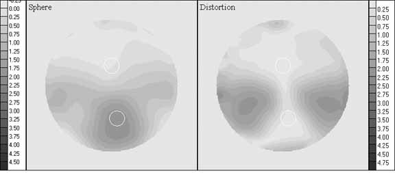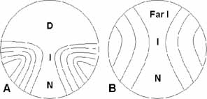 GENERAL Since their introduction to the U.S. market in the 1960s,3 PALs have steadily increased their share of the multifocal market. Several studies have shown a large percentage of patients prefer PALs compared to bifocal lenses.4–6 PALs provide a continuous change of power from distance through intermediate to near that provides the wearer with a seamless visual space and eliminates the unusable area of visual space caused by the top line of a bifocal segment. A detracting feature of PALs is that the design necessarily results in unwanted astigmatism in the periphery of the lens, usually located in the lower diagonals relative to lens center. PALs have both cosmetic and vision advantages compared to segmented multifocals. The cosmetic benefit results from the seamless design and is apparent. The vision advantage results from elimination of the bisecting region of unusable vision associated with the top of the bifocal segment, resulting in contiguous visual space from distance through intermediate to near. The vision advantage with PALs compared to bifocals is supported by a study that showed patient preference for PALs compared to a blended bifocal,7 both of which are seamless. The strong preference for PALs compared to bifocals is further supported by another study8 in which 265 habitual bifocal wearers were fitted with PALs: 92% of these patients preferred the PALs. Because progressive lenses have no image jump and no areas of intermediate blur, many wearers describe their vision with progressive lenses as more natural than with bifocals. OPTICAL CHARACTERISTICS Progressive addition lenses are designed to provide distance viewing in straight-ahead gaze, a gradual progression of power in an intermediate corridor, and the full addition power lower in the lens. The power change is accomplished by increasing the curvature of the front surface (i.e., decreasing the radius of curvature) along the corridor toward the bottom of the lens. Because the add must be spherical in nature, the curvature must increase equally in all meridians (i.e., it must increase in the horizontal as well as the vertical meridian). As result, the horizontal curvature is flatter in the upper portion of the lens and steeper in the lower portion of the lens. To reconcile the curvature disparity and to make a seamless lens, surface curvature must be altered in the lower quadrants of the lens. This results in the unwanted astigmatism. Therefore, a necessary and undesirable side effect of the gradual progression of power is unwanted astigmatism in the periphery of the lens. The pattern of unwanted astigmatism is a defining characteristic of individual PAL designs. The unwanted astigmatism limits the error-free viewing zones of the PAL, resulting in considerably narrower error-free distance, intermediate, and near-fixation fields than typical bifocal lenses. The magnitude and location of unwanted astigmatism are worse with higher adds (greater change in curvature required) and when the distance and near centers are closer to one another (curvature must change over a shorter distance). Primarily as a result of the latter, the near zone of a PAL is lower in the lens than for a FT bifocal. Whereas a very wide near zone is attained with a FT bifocal with approximately 16 to 20 degrees of ocular depression, most PALs require gaze depression of 30 to 35 degrees to obtain the near zone, one that is also considerably narrower than provided by a FT bifocal. A common method to represent the optics of PALs is with contour plots of the spherical equivalent and unwanted astigmatism powers as shown in Figures 4 and 5. Because of the complex nature of the optics there are literally an infinite number of possible PAL designs and dozens of different designs are currently available. Although most current PALs defy clear categorization, it is instructive to consider the differences between a “hard” and “soft” design. The lens in Figure 4 shows characteristics of a hard design. Relatively speaking, a lens of hard design has wider error-free distance and near-viewing zones, the area of the lens with unwanted astigmatism is relatively small, and the magnitude of the unwanted astigmatism is large. The separation between the distance and near centers is shorter and the rate of power change along the corridor is greater. The lens in Figure 5 shows soft design characteristics: narrower error-free distance and near-viewing areas, larger area of unwanted astigmatism but of lower magnitude, distance and near centers are farther apart, and a lower rate of power change in the corridor.