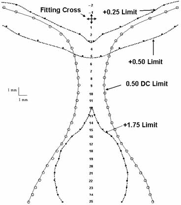 FITTING PROGRESSIVE ADDITION LENSES Both the vertical and horizontal positioning of the PAL within the eye of the frame are critical. Because the near addition in a PAL is relatively low in the lens, a frame with a relatively large B (vertical) dimension should be selected, preferably larger than 30 mm. Frames with adjustable nose pads are also advisable, to enable postdispensing adjustment of the location of the lenses before the eyes. The frame must be properly adjusted to include pantoscopic angle, vertex distance, and vertical wearing position prior to measuring the lens location. PALs are designed to have the fitting cross placed directly in front of the pupil with normal straight-ahead gaze. For each design this provides the optimal location of the viewing zones and the optimal binocular use of the lenses. The vertical height of the fitting cross should be measured from the pupil down to the lowest edge of the lens in the frame. The ratings in Table 4 show that considerably greater near areas and widths are attained with greater fitting heights. Only a few PALs provide a near-viewing zone with a fitting height of 16, and a fitting height of 22 provides considerably greater near zone than a fitting height of 18 for all of the lenses. Small frames, which result in shorter fitting heights, require careful selection of PAL design (far left columns of Table 2). Even with a properly selected short-corridor PAL, fitting heights shorter than 18 necessarily result in some compromise of the near-viewing zone and the patient should be advised of such. The compromised near zone will be noticeable in conditions of low illumination (menu in a restaurant) because of a larger pupil, high reading demands (office work or reading a book in the evening), or viewing small print (phone book). Many patients consider these as reasonable trade-offs for the fashionable small frame. Separate reading glasses or OPLs can be prescribed for specific near-viewing tasks. Accurate measurement of the PD is particularly critical for successful wearing of a PAL. This is because of the narrowness of the intermediate channel that is directly below the fitting cross. The narrowest portion of the average PAL (Fig. 6) is approximately 3 mm, or about the same size as the pupil of the eye. If the pupils of both eyes are to be able to simultaneously view through the channel, there is essentially no tolerance for error in the separation of the two lenses. Any error in the separation of the lenses relative to the PD of the patient results in one of the eyes viewing through an edge of the channel when the other is centered in it. Improper measurement of PD may be the largest reason for patient nonacceptance of PALs. PD measurement with a pupillometer is probably the most accurate method. Accurate measurement of the total PD is the most important, however, it is also advisable to specify the split, or monocular components of the PD as enabled by a pupillometer. ADAPTATION TO PALS Some patients have difficulty adapting to PALs. However, this problem has lessened considerably with newer designs and the high acceptance rates of PALs indicate this problem is becoming uncommon. Adaptation problems can be related to spatial distortion resultant from the pattern of unwanted astigmatism in the lower quadrants of the lens. Such patients will report swimming sensations, spatial disorientation, warped appearance of lines, or vague complaints. Other patients may have difficulty with the width of the distance, intermediate, or near-viewing zones. Distortion is less and zones are wider for lower adds, therefore, adaptation is easiest for the beginning presbyope. Adaptation to a PAL will be more difficult for a first-time wearer with a higher add. As with most spectacle lens adaptation, it may take up to 2 weeks of continuous wear for adaptation. Adaptation difficulties can often be managed by adjusting the pantoscopic angle, the vertex distance, or the fitting height (if the frame has adjustable nose pads). Verify that the distance between lens centers matches the patient's PD; mismatch can certainly cause adaptation problems. If the patient difficulties concern the width or area of one of the viewing zones, consult Tables 3 through 7 to determine if the complaints match the lens characteristics and whether another PAL design would resolve the problem. If the problems cannot be resolved, common industry practice is to replace the PAL lenses with bifocals with no additional charge to doctor or patient. | |||||||||||||||||||||||||||||||||||||||||||||||||||||||||||||||||||||||||||||||||||||||||||||||||||||||||||||||||||||||||||||||||||||||||||||||||||||||||||||||||||||||||||||||||||||||||||||||||||||||||||||||||||||||||||||||||||||||||||||||||||||||||||||||||||||||||||||||||||||||||||||||||||||||||||||||||||||||||||||||||||||||||||||||||||||||||||||||||||||||||||||||||||||||||||||||||||||||||||||||||||||||||||||||||||||||||||||||||||||||||||||||||||||||||||||||||||||||||||||||||||||||||||||||||||||||||||||||||||||||||||||||||||||||||||||||||||||||||||||||||||||||||||||||||||||||||||||||||||||||||||||||||||||||||||||||||||||||||||||||||||||||||||||||||||||||||||||||||||||||||||||||||||||||||||||||||||||||||||||||||||||||||||||||||||||||||||||||||||||||||||||||||||||||||||||||||||||||||||||||||||||||||||||||||||||||||||||||||||||||||||||||||||||||||||||||||||||||||||||||||||||||||||||||||||||||||||||||||||||||||||||||||||||||||||||||||||||||||||||||||||||||||||||||||||||||||||||||||||||||