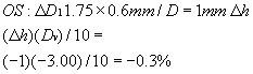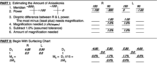 (This is a minification, since it represents a decrease in vertex distance.) The magnification from Ms with this change in D1 is then 3.6% - 0.6% = 3.0%. The right lens is 4.2% and the left lens is now 3%, and the difference is 1.2%, which is very close to the 1% needed. There is no need to change t, center thickness. This is a practical endpoint. Discussion To decide which curve to use on the left lens for the front surface, I first consulted the surfacing chart to see what curves are available that are less than the 11.00-D curve on the right lens. I found these three possible curves: 10.25, 9.50, and 8.75 D. The 10.25 D gives shape magnification of 10.25 × 5.7/15 = 3.9%, which did not seem to be enoughof a change, whereas the 8.75-D curve was 8.75 × 5.7/15 = 3.3%. At first this seemed to be the curve of choice, but when the power factor was calculated, the difference, (11.00 - 8.75) = 2.25 D, gave a1.6-mm vertex distance change (2.25 × 0.7), and this vertex distance change gives minification of 1.0%: (1.6)(+ 6.00)/10 = -1%. This 1% loss of magnification when added to the 3.3% would have resulted in 2.3% for the left lens, and this when subtracted from 4.2% of the right lens would become 1.9% magnification on the right eye, which is 0.9% too much magnification. Recalculating, using the 9.5-D figure gave the correct answer. Other possibilities include the following:
