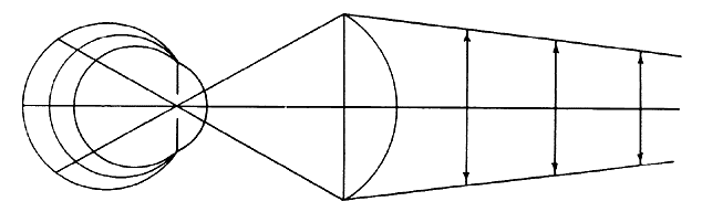 In use, the indirect ophthalmoscopy lens must be held at a distance in front of the entrance pupil of the eye approximately equal to the secondary focal distance of the lens. The aerial image of the fundus will then be at approximately the same distance on the opposite side of the lens in an emmetropic eye, closer to the lens in myopia, and farther from the eye in hyperopia (Fig 10).