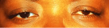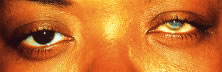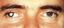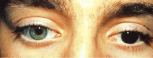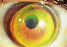 We have significant experience with this lens with reasonably good results. Although the lens does not correct the color defect, it does permit patients to make a discriminatory judgment of color. During the initial patient evaluation, it is very helpful to use a trial lens to evaluate effectiveness. Patients can often improve their results in the Ishihara plates from properly identifying 1/15 plates to identifying 10/15 to 13/15 correct plates. Proper color discrimination is very important in numerous professions such as: electrical engineers, uniformed forces, artists, painters, printers, decorators, and all those professions in which color discrimination is important. A word of caution to patients wearing the X-Chrom lens: This lens has detrimental effects on space localization of moving objects and other aspects of binocular vision. Persons operating moving vehicles wearing a tinted lens over one eye may experience hazardous distortions of the positions of perceived objects and may, therefore, be dangerous drivers in certain circumstances. Conservative judgments are justified until the extent of the hazards is better understood. Ideal lens fitting involves special attention to avoiding excessive lens movement and decreasing lens thickness to improve visual results. Otherwise, techniques used for fitting any other conventional rigid lens should be applied. Motivation is quite important because the lens may be cosmetically undesirable (bright red lens in only one eye) and there is an adaptation period that the patients must undergo. The use of bright ambient light is highly recommended to maximize results. THERAPEUTIC USES OF PAINTED LENSES Painted contact lenses have a variety of uses: cosmetic, therapeutic, handling, and informational. Although a valuable tool in total patient care, the therapeutic use of tinted lenses is, unfortunately, not often considered. There are several basic categories or types of painted lenses that can be obtained, considering that multiple variables can be incorporated into any of these lenses. As a general rule, soft (hydrophilic) lenses are used for painting in therapeutic lenses (although rigid lenses may be used rarely). The broad categories of tints include: translucent (Fig. 13); opaque (iris) (Fig. 14), with or without pupillary opening; clear or black pupil; clear lens with black pupil only (Fig. 15), totally black (occluder) (Fig. 16) lens, and others. Although some lenses are commercially available (with predetermined colors and options), others are custom made for each patient. The type of lens chosen for each patient will be dictated by the patient's needs and desires. As a general rule, custom made lenses will be more costly and take longer to obtain but usually accomplish a better cosmetic result and, therefore, greater success. Painted lenses can be obtained with or without refractive power, depending on the patient's needs. Indications for the use of therapeutic painted lenses include: covering corneal scars, creation of a pupil, pupillary occlusion, diplopia, heterochromia, phthisis, amblyopia, aniridia, and photophobia. While evaluating a patient for a painted lens, we must take into consideration not only the obvious cosmetic or clinical deformities but also the patient's realistic needs, desires, and expectations. It could be quite frustrating if unrealistic expectations are set or the patient's needs are not met.
