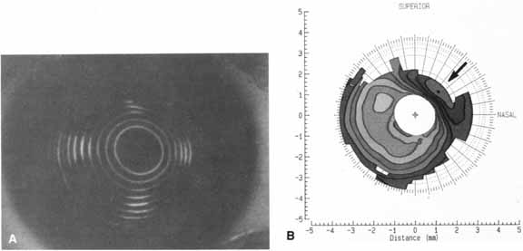 may be present. It is also important to recall that the dioptric power given by the keratometer is an estimate of the total corneal power based on the measured radius of curvature and assuming normal corneal thickness and posterior corneal curvature. Therefore, if the keratometer is used, the anterior surface curvature measurements are more reflective of the refractive change. Keratoscopy provides more information about the shape and refractive power of the corneal surface than does keratometry (Fig. 1).4 Significantly more detail can be obtained by computer analysis of such images. Most currently used systems for corneal topographic examination utilize Placido disc images. Multiple illuminated concentric rings are placed in front of the cornea, and the reflections of the rings are viewed and analyzed. Corneal curvature can be determined at many points along each ring, giving a detailed image of the corneal surface power (Fig. 2). Unfortunately, this also requires some assumptions about corneal shape and may be less accurate on aspheric surfaces. Elevation maps can also be derived from the curvature data.