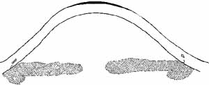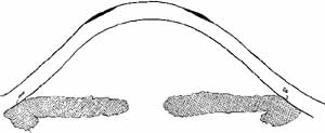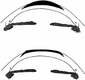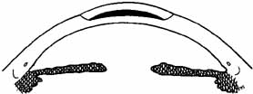 Many other non-Placido disc systems have been used for corneal topography analysis. The most commonly used today (Orbscan, Bausch & Lomb, Rochester, NY) is based on analysis of multiple Scheimpflug slit images of the cornea. Anterior corneal elevation, corneal thickness, and posterior corneal shape can be determined. LAMELLAR REFRACTIVE KERATOPLASTY PROCEDURES Refractive keratoplasty can be divided into lamellar procedures and nonlamellar procedures. Nonlamellar procedures alter corneal curvature without the addition or removal of tissue. Radial keratotomy and various types of incisional surgery for astigmatism are the most common nonlamellar procedures. Lamellar procedures involve the removal of tissue from the cornea or the addition of tissue or synthetic material to change its refractive power. Most lamellar procedures change the refractive power by altering the anterior corneal curvature, which can be accomplished in several ways. A tissue or hydrogel lens can be placed within the corneal stroma (keratophakia and intrastromal hydrogel lens implantation); a tissue lens can be placed on the anterior corneal surface (epikeratophakia); the anterior lamellae of the cornea can be removed, shaped, and replaced (keratomileusis); or the excimer laser can be used to remove corneal stroma, either on the surface or within the stroma. In one lamellar procedure (intrastromal polysulfone lens implantation), a synthetic lens with a high refractive index was placed within the cornea and changed the refractive properties of the cornea without altering the anterior corneal curvature. Each of these procedures is briefly described in the following sections. KERATOPHAKIA AND INTRASTROMAL LENS IMPLANTATION Modern lamellar refractive keratoplasty originated with Jose I. Barraquer's work in Colombia, South America. In 1949, Barraquer developed keratophakia for the correction of aphakia because of the dissatisfaction with aphakic spectacles and the contact lenses and intraocular lenses that were available at that time. His results were first reported in 1963,5 and the procedure was introduced in the United States in 1977.6 Attempts to adapt Barraquer's classic form of keratophakia for the correction of myopia have not been successful. In keratophakia, a plus-powered tissue lens of donor corneal stroma is implanted intrastromally into the patient's cornea (Fig. 3). The portion of the patient's cornea that overlies the implanted tissue lens conforms to the anterior surface of the tissue lens, and the anterior corneal curvature steepens.
