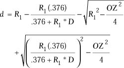 of the following equation: ![]() where Dc is the correction at the corneal plane in diopters, Ds is the correction at the spectacle plane in diopters, and v is the vertex distance in meters. Determination of Desired Postoperative Anterior Corneal Curvature The desired postoperative radius of anterior corneal curvature can be calculated with the following equation, which is derived from Equation 1: ![]() where rf is the postoperative radius of anterior curvature in meters, ri is the preoperative radius of anterior curvature in meters, and Dc is the correction at the corneal plane in diopters. Equation 3 is for a thin lens and does not take into account