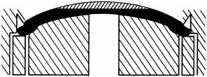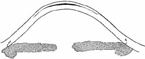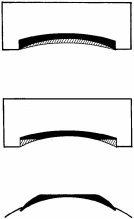 Prior to surgery, the donor corneal stroma is lathed with a cryolathe, which is a modified contact lens lathe that keeps the tissue frozen as it is being lathed. At the time of surgery, an anterior lamellar section of tissue is removed from the patient's cornea with a microkeratome, which is similar to a carpenter's plane. The prelathed tissue lens is placed on the exposed stromal bed, and the anterior lamellar section that was previously removed from the patient's cornea is sutured back into place on top of the tissue lens. It is necessary to remove an anterior lamellar section of tissue from the patient's cornea before implanting the tissue lens. If the tissue lens is placed in a lamellar pocket without a 360° anterior incision that penetrates Bowman's layer, there is little effect on the anterior corneal curvature;7,8 unless Bowman's layer is severed completely, the posterior layers of the cornea change shape rather than the relatively inelastic anterior layers (Fig. 4).