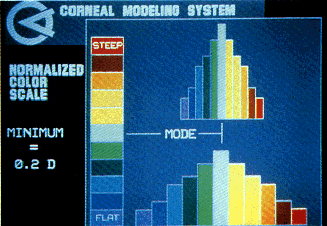 EXCIMER LASER PHOTOREFRACTIVE KERATECTOMY When excimer laser photorefractive keratectomy becomes approved in the United States, it will be essential for the clinicians performing these procedures to have a thorough understanding of videokeratography. Videokeratography is not only essential for screening candidates for these procedures, but it also provides important information regarding the quality of the ablation zone, the diameter of the ablated zone, centration of the ablation, and the stability of the topographic alterations. In addition, irregularity and multifocality within the ablation zone can be determined. Decentration of the ablation zone, as determined by videokeratography, might explain postoperative halo or glare effect. Irregular ablation zones (as is seen in “central islands”) often explain decreased acuity and decreased quality of vision after these procedures (Fig. 18). Recognition of these abnormal zones has resulted in modification of the procedure to prevent their occurrence.42–46