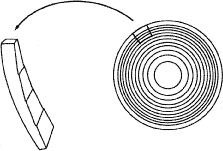 The smooth transition between the zones also minimizes any loss of available light that may occur as a result of diffraction where there is an abrupt change in diopter power, such as occurs in refractive bifocal lenses. Thus the Array lens focuses all available light and, unlike refractive bifocal lenses, performance is less sensitive to changes in pupillary diameter.4 The Domilens Progress 1 is a near-dominant refractive IOL with a central aspheric zone that provides near vision. Its progressive aspheric surface continuously increases to an add power of ±4.75 D, with distance vision through the periphery; it provides intermediate vision in between. Diffractive lenses such as the CeeOn (811E, 808X; Pharmacia Upjohn, Kalamazoo, MI) and the 3M (825X, 815LE; Alcon, Fort Worth, TX) are bifocal. The anterior surface of the lens is a spherical refractive surface. A diffractive surface is created on the posterior surface by removing wedge-shaped annuli of lens material (Fig. 4). This alters the phase of the incident light to form a diffraction grating. The zero and first orders of diffraction are captured by the retina. Distance focus is the combined power of the spherical anterior surface with the zero order of diffraction from the posterior surface. Near focus is achieved by the combination of the spherical anterior surface and the first order of diffraction from the posterior surface. About 41% of the light is focused for near vision and 41% of the light is focused for distance vision. The remaining light is lost to higher orders of diffraction that are unfocused on the retina. Thus the diffractive bifocal lenses have the disadvantage of being unable to use approximately 18% of the incoming light. However, they have the advantage of being less affected than refractive bifocal IOLs by lens decentration or pupillary diameter. |