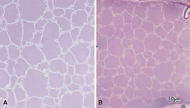 Thus, a compelling argument can be made that abnormal suture planes and cortical cataract opacities are one and the same. At surgery, the cortex of cortical cataract lenses is softer than the nucleus. Histologically, the cortex of these lenses feature swollen and liquefied fibers. It has been proposed that an increased uptake of water forces the cataractous cortical fibers apart between radial cell columns and concentric growth shells (lamellar separation). This proposition leads to speculation that the lens may be attempting to alter the structure of a localized site of increased scatter. Cortical opacities, seen to greatest advantage by retroillumination slit-lamp biomicroscopy, correspond to areas of lamellar separation that in turn are believed to correlate with “fiber folds” seen by SEM.14 Ultrastructurally, the opacities are characterized by variable amounts of degenerated cortical fiber fragments and ceroid bodies (lipofuscin), presumably the result of enzymatic digestion. Morgagnian cataracts are considered a special form of mixed cortical and nuclear cataract typified by complete liquefaction of the entire cortex. Again, it is tempting to speculate that the zones of liquefaction are an attempt by the lens to eliminate areas of scatter. This premise is strengthened by the fact that the nucleus in aged cortical cataract lenses has normal sutures and thus, would not need to undergo any internal alterations to improve light transmission. It also should be noted that to date, aged nuclear cataracts also seem to have normal sutural anatomy. |