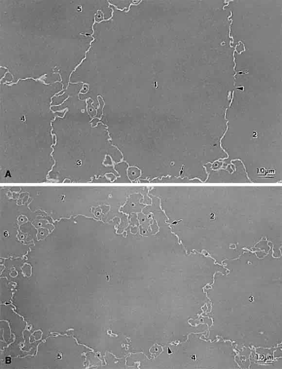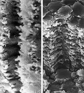 progression. It generally is believed that all PSCs are characterized by a proliferation of dysplastic transitional zone lens epithelial cells.15–18 Transitional zone cells are normally high columnar cells that already have assumed the uniform hexagonal cross-sectional profiles that are maintained after fiber terminal differentiation. These cells normally are arrayed in ordered meridional rows just above the lens equator. As lens growth proceeds, these cells rotate 90° along their polar axis while simultaneously beginning the process of bidirectional elongation to become fiber cells. These dynamic events occur in the bow region of the lens, which can be shown to advantage in polar histologic sections. In the earliest forms of PSCs, the meridional rows are uncharacteristically disorganized. As PSC formation proceeds, the transitional cells either rotate incompletely or not at all in the bow region. These cells then are believed to migrate progressively toward the posterior pole while simultaneously enlarging into ovate-shaped Wedl or bladder cells.18 PSCs often are seen overlain by additional strata of relatively normal elongating fiber cells. Ultrastructurally, the opaque regions of PSCs feature few organelles, degenerating nuclei, elaboration of crystallin proteins, a prominent cytoskeleton, and lateral membrane interdigitations between neighboring cells. Thus, the cataract cells of PSCs are considered to be characterized by dysplastic fibers that exhibit cellular alterations consistent with fiber terminal differentiation. PSCs appear to have a preferential migration path that is associated with the lens sutures. Retroillumination slit-lamp images often reveal an asymmetrical stellate pattern of PSCs that is consistent with the continuously evolving star and asymmetrical star lens sutures that are formed as a function of age. In a recent study19 of Royal College of Surgeons (RCS) rats, an animal model of autosomal recessive retinitis pigmentosa, correlative light, scanning, and transmission electron microscopic analysis clearly demonstrated that the posterior subcapsular opacity is the result of abnormal posterior suture formation rather than a proliferation of dysplastic transitional zone lens epithelial cells (Figs. 7 and 8). The RCS rat PSC is composed of markedly enlarged and irregular posterior fiber ends aberrantly curved away from the polar axis toward the vitreous rather than overlapping and abutting to form suture branches within and between concentric growth shells. Light microscopic analysis revealed evidence of progressively more numerous, enlarged, and irregular ovate cellular profiles at the posterior pole. However, there was no evidence of Wedl cells either within the meridional row region or along a migratory path from the equator to the posterior pole at any age. Transmission electron microscopy (TEM) analysis confirmed that the size and abnormal shapes of cellular profiles were consistent with SEM analysis and that nuclei never were observed within the plaque. Preliminary studies of transgenic mice developed as a model for autosomal dominant retinitis pigmentosa show PSCs resulting from sutural compromise and again give no indication of a proliferation of dysplastic transitional zone cells. The results of these studies raise important questions. Are there two types of PSCs, one that involves a proliferation of dysplastic cells and one that involves sutural malformations? Alternatively, are all PSCs a function of abnormal suture formation, a structural compromise that only recently has been elucidated by correlative ultrastructural analysis? Clinically, these issues are relevant because some PSCs have been noted to spontaneously regress and most RCS rat PSCs effect a form of recovery (internalization). These facts suggest that PSCs may be responsive to therapeutic intervention. At the time of surgical removal, the ultrastructure of mature PSCs are not dissimilar to those of mature cortical opacities. They are characterized by fragmentation, swelling, and degeneration of the ends of elongating and superficial cortical lens fibers. In addition, multilamellar membranous bodies in complex patterns also are typical of PSCs. Globules noted in some PSCs are likely to be necrotic fragments of fiber ends. Similar structural alterations frequently are seen in other types of cataracts. Dense bodies, consistent with lysosomal activity, have been found in varying amounts at sites of opacity in PSCs. In addition, acid hydrolases capable of eliminating membrane waste have been found to be localized at lens sutures. The presence of these lytic enzymes is believed to explain the “zone of liquefication” in PSCs. All the structural alterations noted to occur in PSCs are consistent with the theory that PSCs have a dynamic nature, with the lens attempting to repair itself more or less successively as a function of age and severity of PSC. |