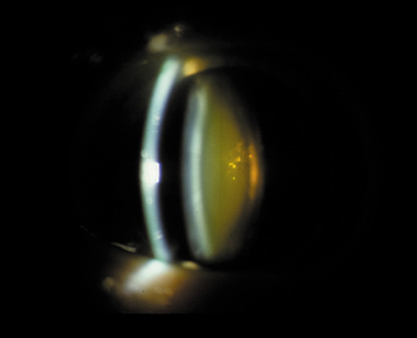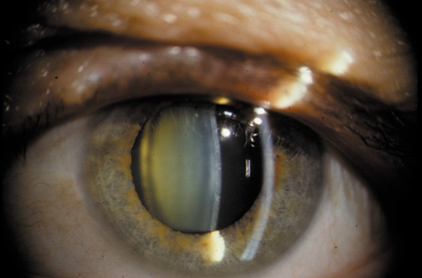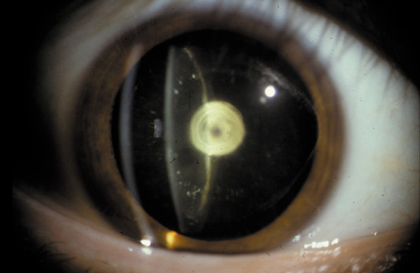 Nuclear cataracts tend to progress slowly. The refractive index of the lens changes as the nucleus progressively hardens, which usually results in increasing myopia.20,21 In some patients this is accompanied by optical distortion, especially of distant images, while near vision remains unaffected. A nuclear cataract is best seen with the narrow-beam direct illumination employed by the slit-lamp, which reveals the color and generalized haze or opalescence of the nucleus. In the early stages, the two halves (cotyledons) of the embryonic nucleus remain visible (Fig. 3). Later the entire nucleus appears as a homogeneous mass in contrast to the cortex (Fig. 4). Retroillumination may show the “oil droplet” effect (Fig. 5). Sometimes one may notice crystals in the lens nucleus (known as a Christmas tree cataract; Fig. 6A and B).