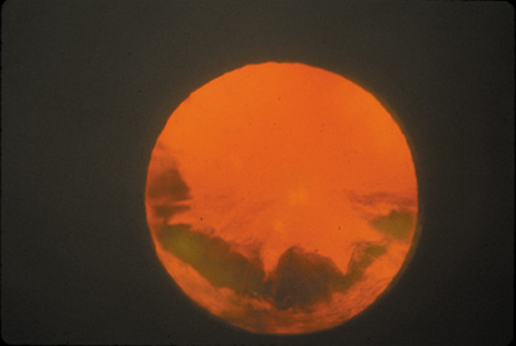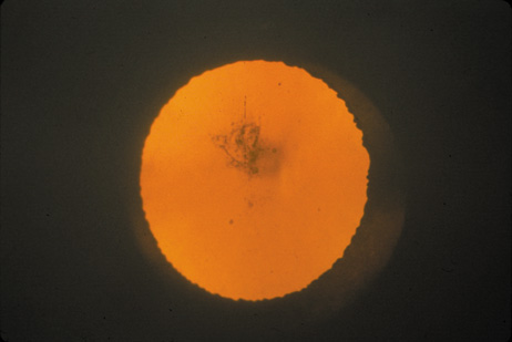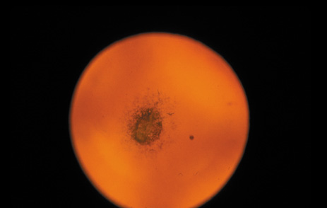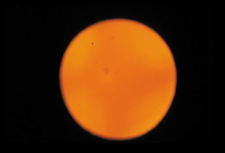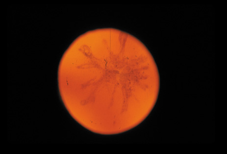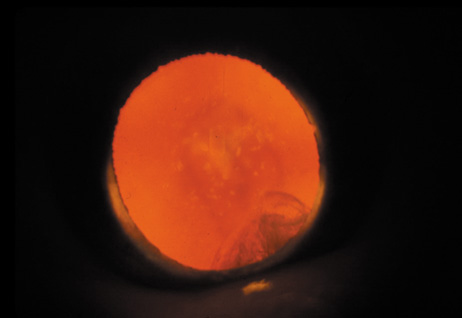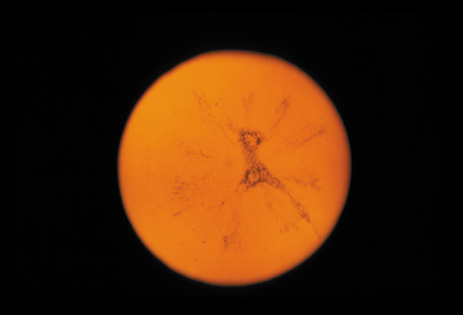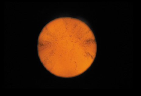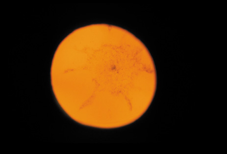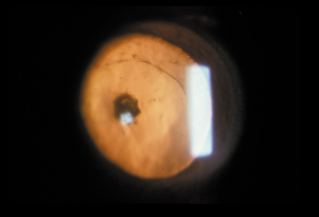One can examine this type of cataract with direct illumination, using the narrow and broad beams of the slit-lamp to show the characteristic granular inner surface immediately in front of the posterior capsule (Fig. 13). The problem with this technique, however, is that patients may not tolerate any prolonged direct illumination because of the glare. Retroillumination is therefore more useful for revealing the outline of the opacity, since it is usually seen as an “island” in the center of the posterior capsule, which is further highlighted by the shadow cast by the opacities.33 However, in the early stages of this type of cataract, the dust-like particles that might be noticeable in the central posterior subcapsular area with direct illumination disappear or are difficult to see with retroillumination (Fig. 14). Eventually this “dusting” becomes dense enough to cast a shadow and thus appear on retroillumination. The smooth orange background of the fundus helps to highlight the rough, irregular pseudopodia-like edges of the central opacity. In advanced stages, the PSC may become a thick, calcified plaque (Fig. 15). During surgery, excessively vigorous scraping or vacuuming of the calcified opacity can lead to rupture of the posterior capsule. Usually, small remnants that are left behind after surgery are reabsorbed and do not interfere with vision; otherwise, they are easily treated with a neodymium : yttrium (Nd:YAG) aluminum garnet laser. Pathologic evidence suggests that most PSCs result from the migration of bow region cells into the potential space (along with accumulated cellular debris) between the posterior capsule and the cortex.34–36